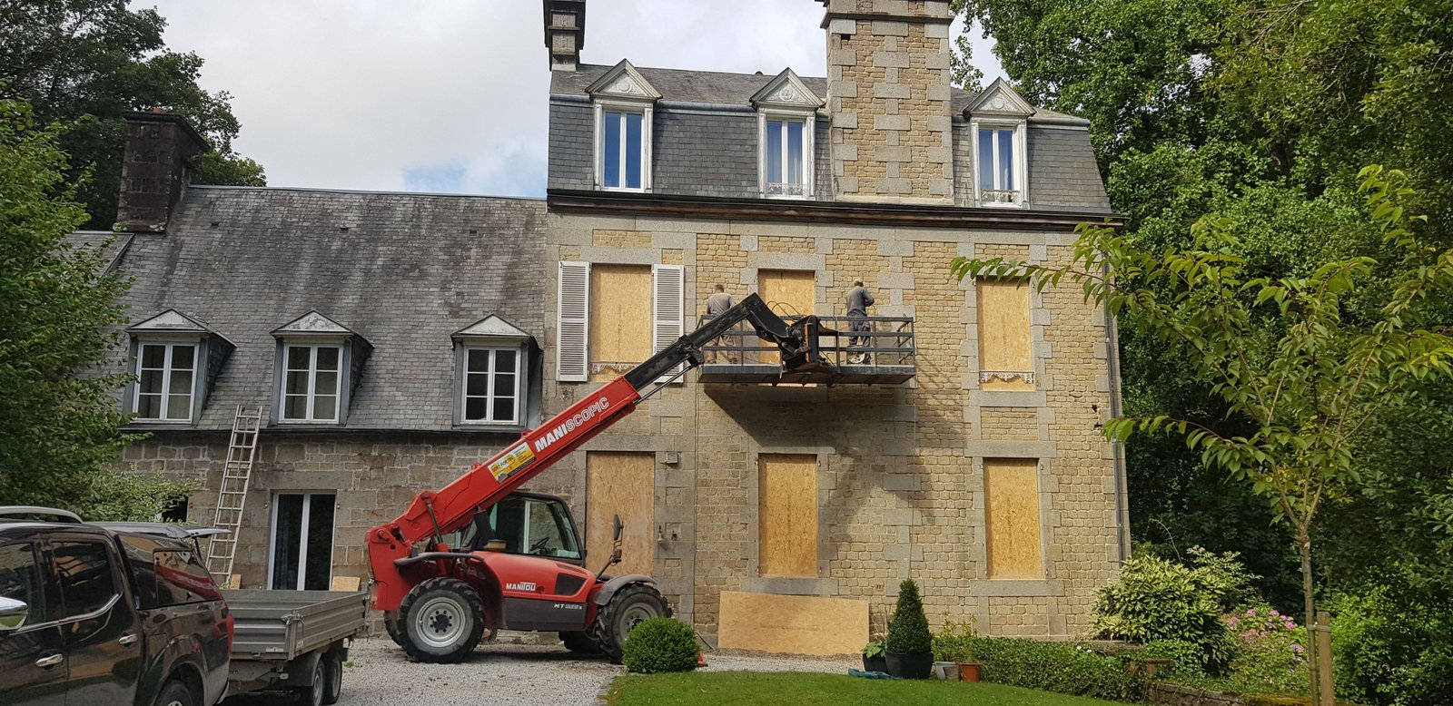 L’échafaudage de 350 mètres carrés, entreposé dans une remorque indépendante, évite aux salariés de charger et de décharger les camions. La flotte de véhicules se compose par ailleurs de deux camions bennes et d’un pick-up dont Loïc Fortin se trouve propriétaire.