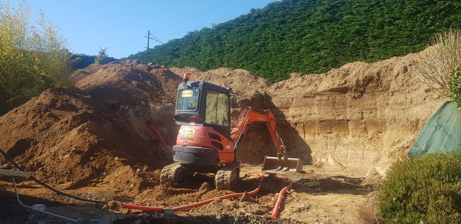Les mini-pelles de terrassement permettent de travailler sur le vidage de maisons, l'arrachage, la réalisation de tranchées, le passage de gaines et de fourreaux. L'entreprise dispose de deux de ces engins. La mini-pelle d'une tonne s’invite à l’intérieur des maisons. Celle de deux tonnes et sept cents kilos, avec cabine, offre l’opportunité de travailler dehors, à l'abri de la pluie et des intempéries.
