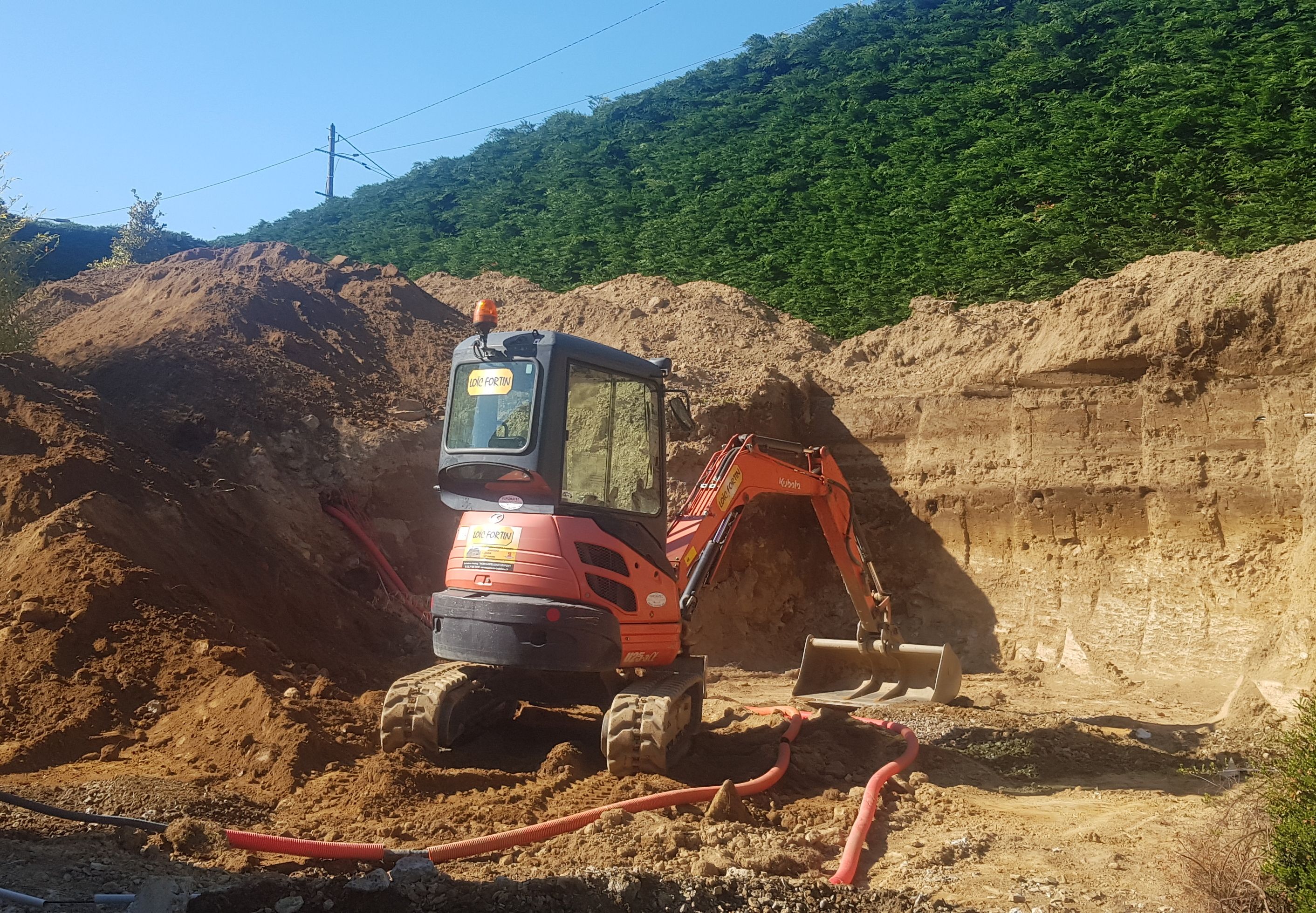 Les mini-pelles de terrassement permettent de travailler sur le vidage de maisons, l'arrachage, la réalisation de tranchées, le passage de gaines et de fourreaux. L'entreprise dispose de deux de ces engins. La mini-pelle d'une tonne s’invite à l’intérieur des maisons. Celle de deux tonnes et sept cents kilos, avec cabine, offre l’opportunité de travailler dehors, à l'abri de la pluie et des intempéries.